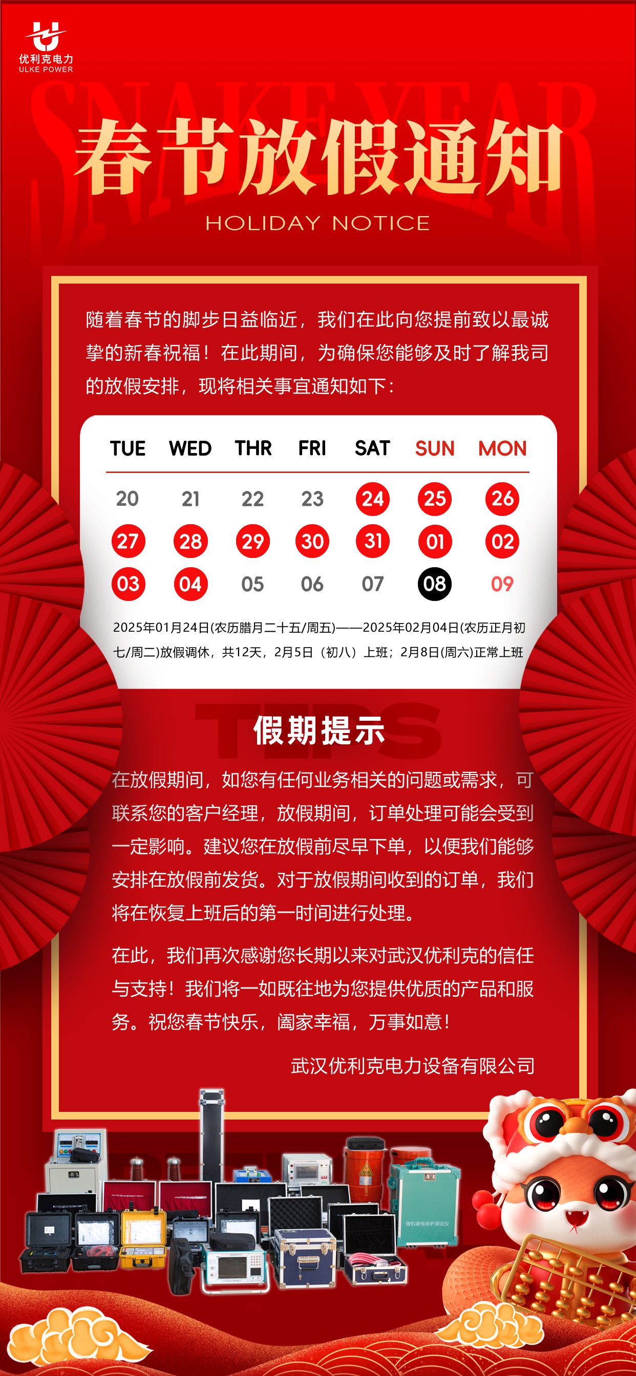 隨著春節(jié)的腳步日益臨近,我們在此向您提前致以最誠摯的新春祝福!在此期間,為確保您能夠及時了解我司的放假安排,現(xiàn)將相關(guān)事宜通知如下:
